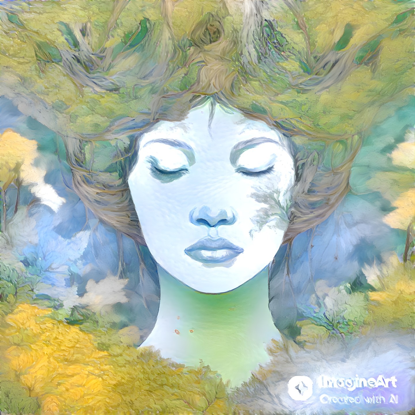 A serene profile of a woman blends seamlessly with a lush tree, her hair becoming branches and leaves. The artwork symbolizes harmony between nature and femininity in vibrant greens.