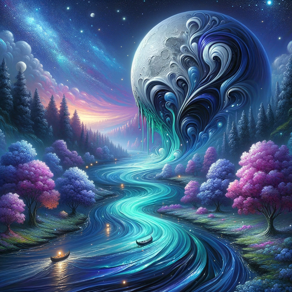 *The oversized silver/indigo moon dripping with shimmering light over a winding river. The lower part of large ethereal moon melts like tempera and flows into the river, merging with the sparkling water and creating a luminous turquoise/teal trail that follows the winding course of the river. Small, boats glide along the water, with soft, glowing lights.
