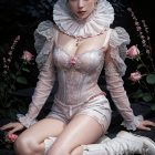 A striking figure sits elegantly, dressed in a silver corset with dramatic ruffles and sheer sleeves. Surrounded by roses, she embodies a blend of glamour and fantasy under a starry backdrop.
