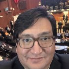 A animated scene depicts a young man in a suit taking a selfie in a legislative assembly, surrounded by surprised onlookers and a backdrop featuring the Mexican flag.