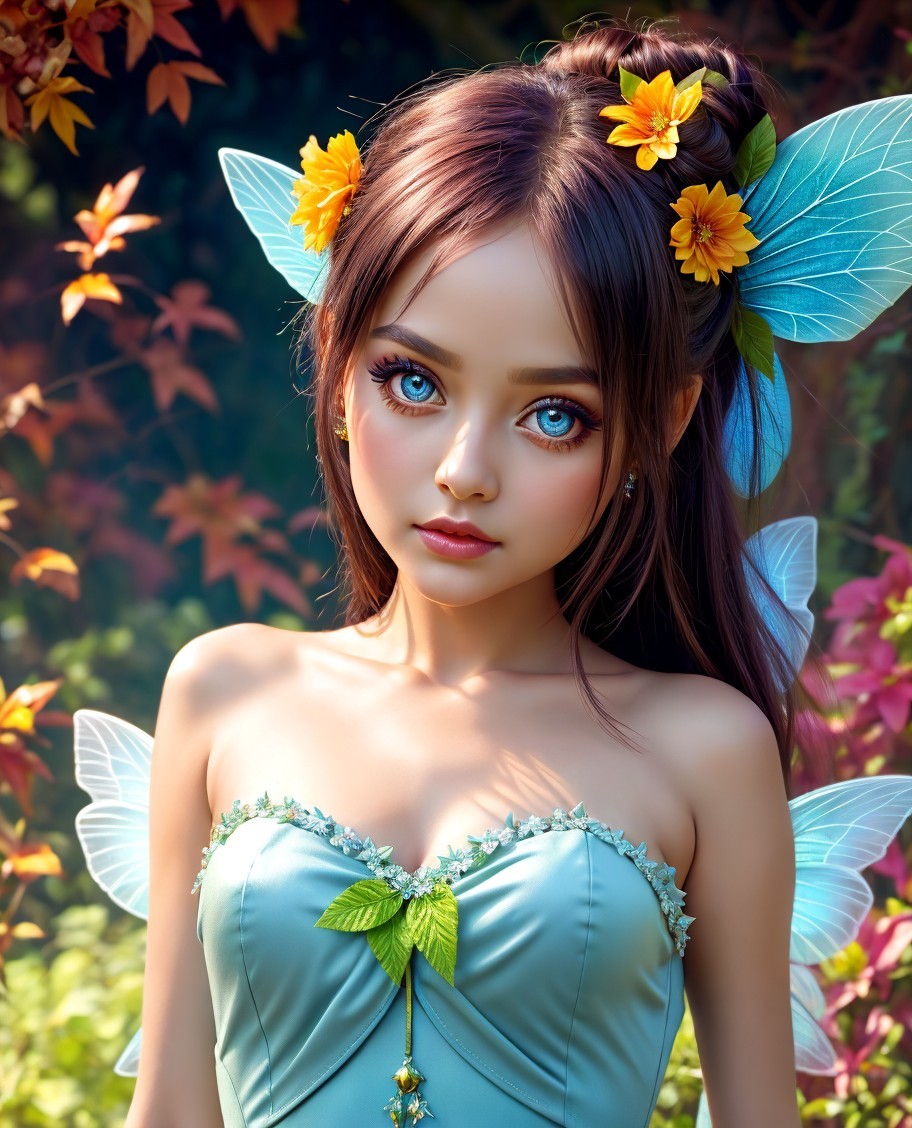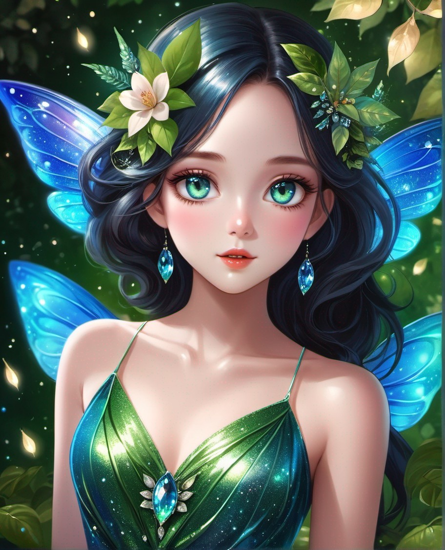 Prompt: Alien fairy girl wearing leaves and flowers. She has deep blue large eyes and a perfect pretty face. She is wearing a shimmering sparkling semirealistic green gown