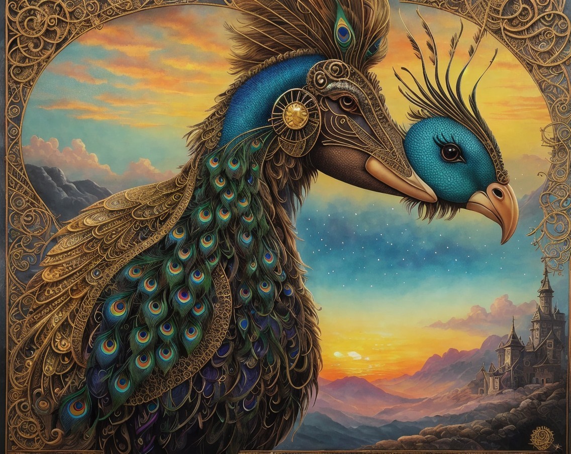 Steampunk-inspired peacock ,sf matte painting movie poster, intricate artwork masterpiece with an ominous atmosphere, adhering to the golden ratio, highly detailed, vibrant, production cinematic character render, ultra high-quality model, echoing the styles of Artgerm, H.R. Giger, and Beksinski, trending on CGSociety and ArtStation, epic, ultra realistic