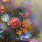 A vibrant floral pattern featuring large, colorful blossoms in shades of pink, purple, and gold. The background shimmers in teal with golden accents, creating a lush, artistic feel.