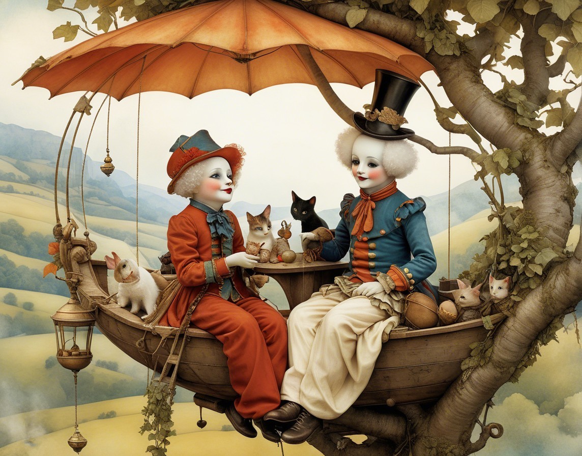 Close up, adorable Pierrot creature mythological world up up and away, in the style of Alexander Jansson. by Catrin Welz-Stein, Michael Parkes