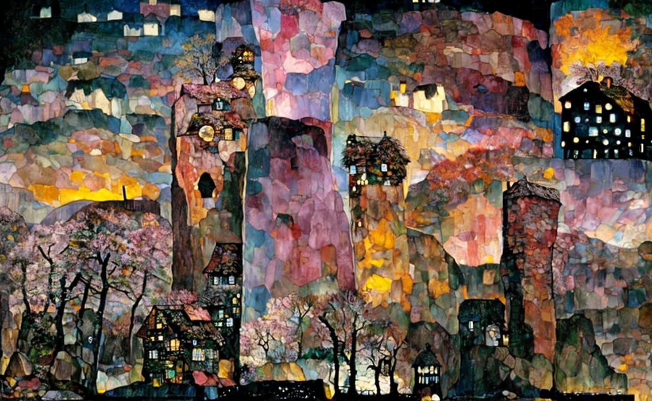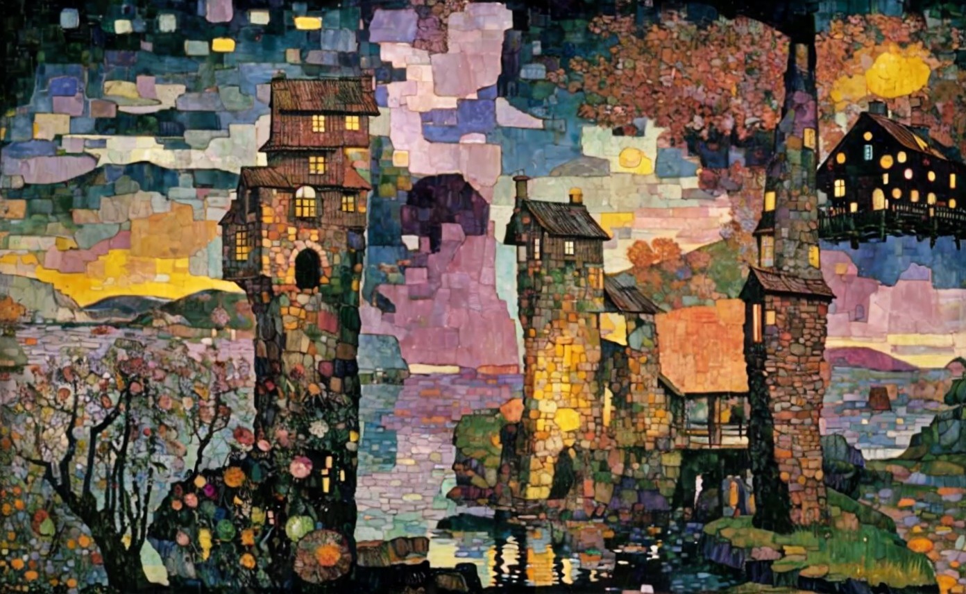 + Prompt:Highland lake. Water mill, and rock cabin. Beautiful water reflections. Trees. Large head-monument in the distance, Landscape filled with colorful rocks. Mixed media details by Tim Burton and Egon Schiele.