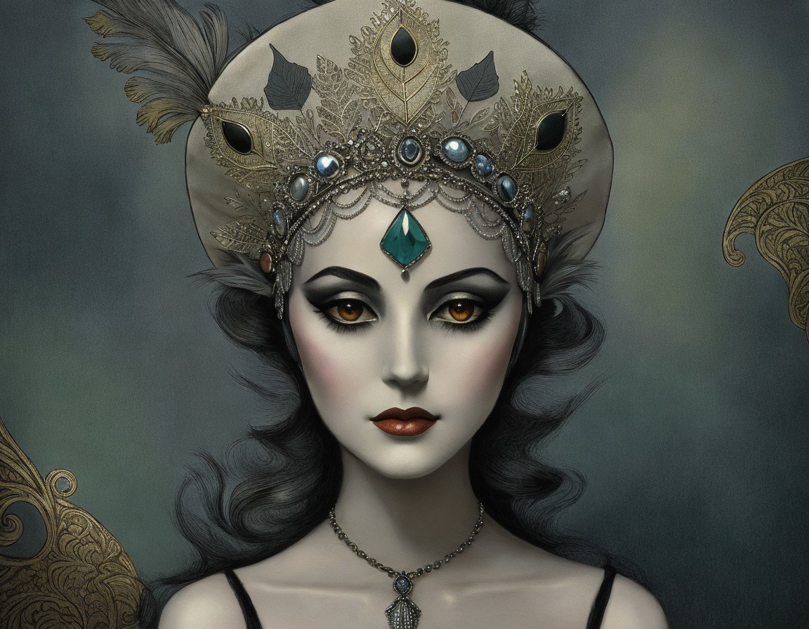A woman with dramatic makeup wearing an elaborate owl masquerade mask and vintage-inspired jewelry, exuding elegance and mystery.
