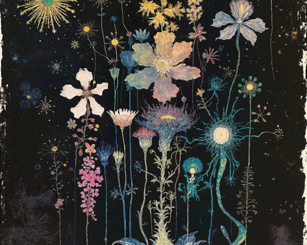 Abstract painting featuring two male figures, patchwork suits, geometric shapes, houses, giraffe pattern,