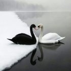 Two swans, one black and one white, gracefully swim together in calm water, their necks elegantly arched towards each other, creating a heart-like shape. The serene setting enhances their beauty.