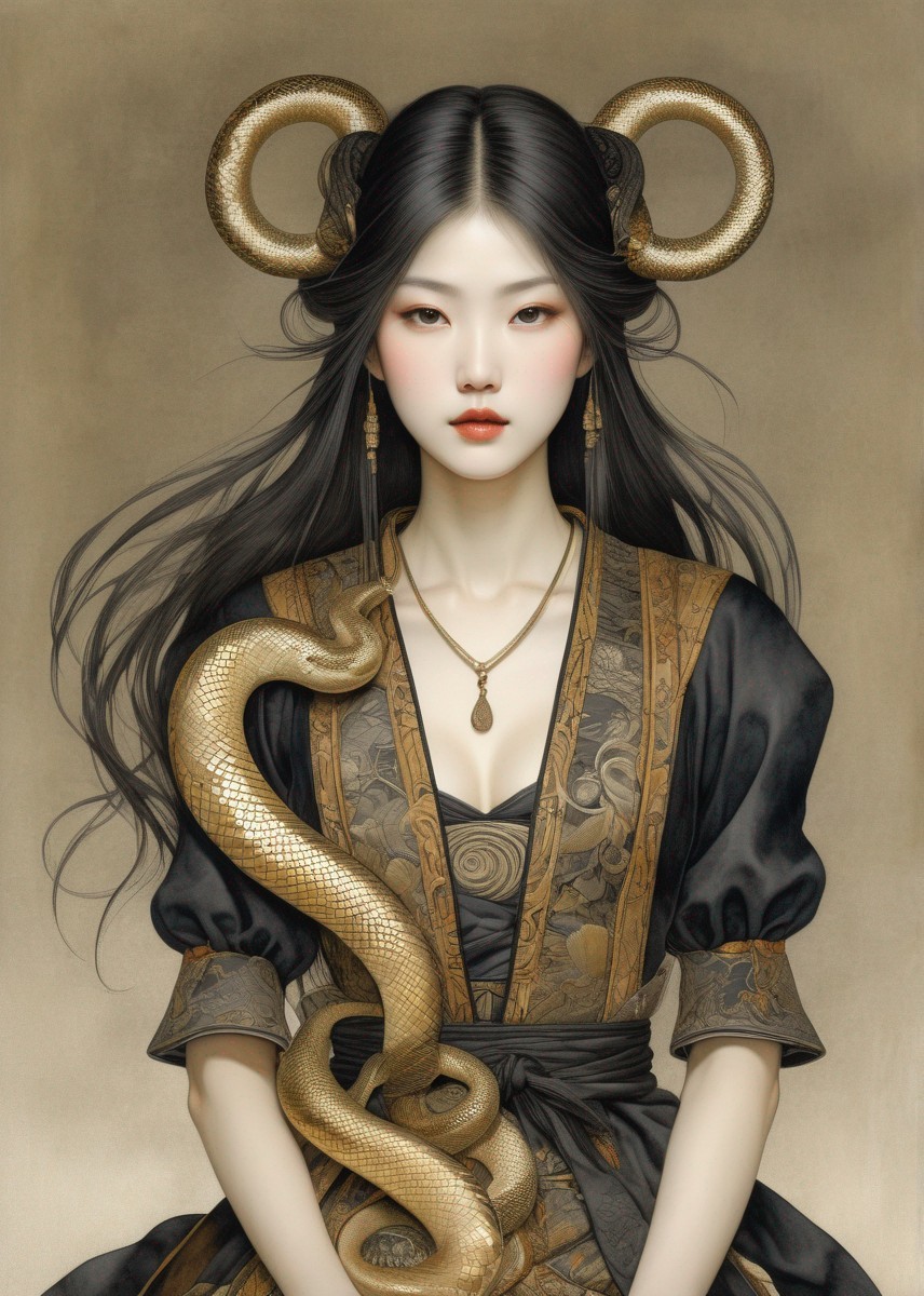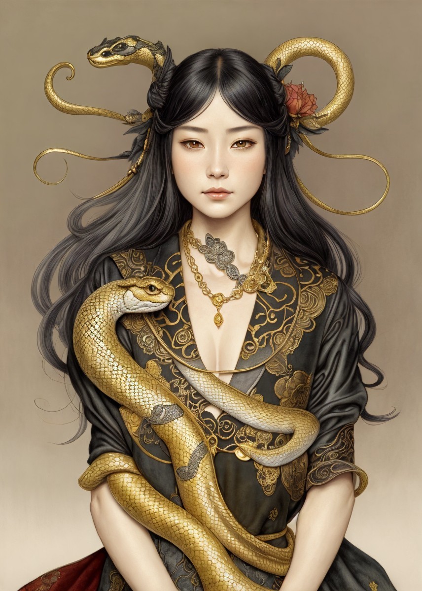 Legend of the Girl and the snake, Medieval Japanese Artists Sumi-e Style, Velvet Black, Shabby, Dull Gold, Amber Gray, Golden Ratio, Surreal Fantasy, Elegant, High Definition Ultra Fine 3D Line, Zenangle Style, Watercolor Patchwork , Arthur Rackham Style, Paul Kidby, Gediminas Prankevicius, Jacek Jerka, Extremely Detailed, Intricate, Thoughtful, HDR, Fractal, Beautiful, Award Winning, Fantasy Look, Fantasy, Crisp Quality