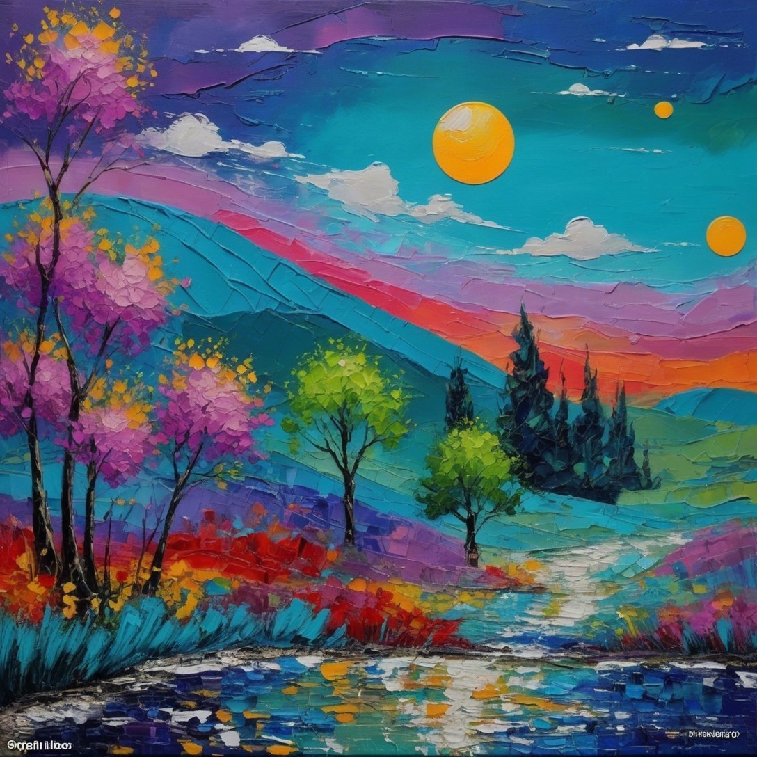 A vibrant landscape with colorful mountains, blooming trees, and a serene river reflecting a bright sun in a blue sky, creating a lively and joyful atmosphere.