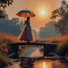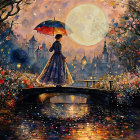 A woman in a colorful dress stands on a bridge, holding an umbrella. The scene is illuminated by a large moon, surrounded by blooming flowers and a charming, serene village.