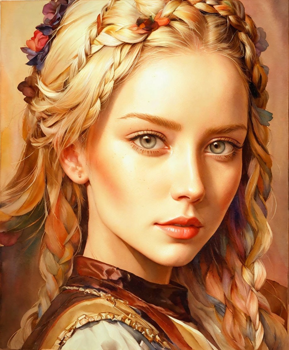 Baroque painting, tints of watercolor and ink, oil on canvas, mosaic, portraiture, stacked-up perspective, green eyes, humanoid, plasticity 1.6, anisotropic filtering 1.9, raytraced shadows 1.8, high coloring 1.9, detailed blonde hairdo with braids, tiny fauvistic cuts with hues, mosscore 1.7, cottagegore 1.9, triadic color scheme beige ochre amber, vibrant luminous strokes, grain, Schregerlines 1.7, hues, plasticity 1.9, complexion 1.4, brightness 1.9, vector 9:5, colorful reflections, lavish, ferocious, synthetic, occult, retropunk, sweaty, stylized illustration 1.5, blurry aura, thick raised impasto, frottage, thick raised impasto,