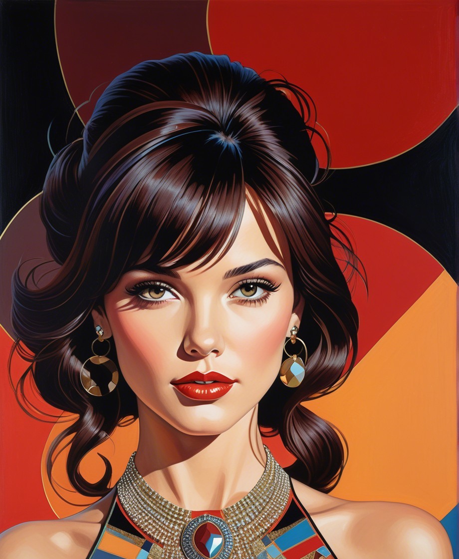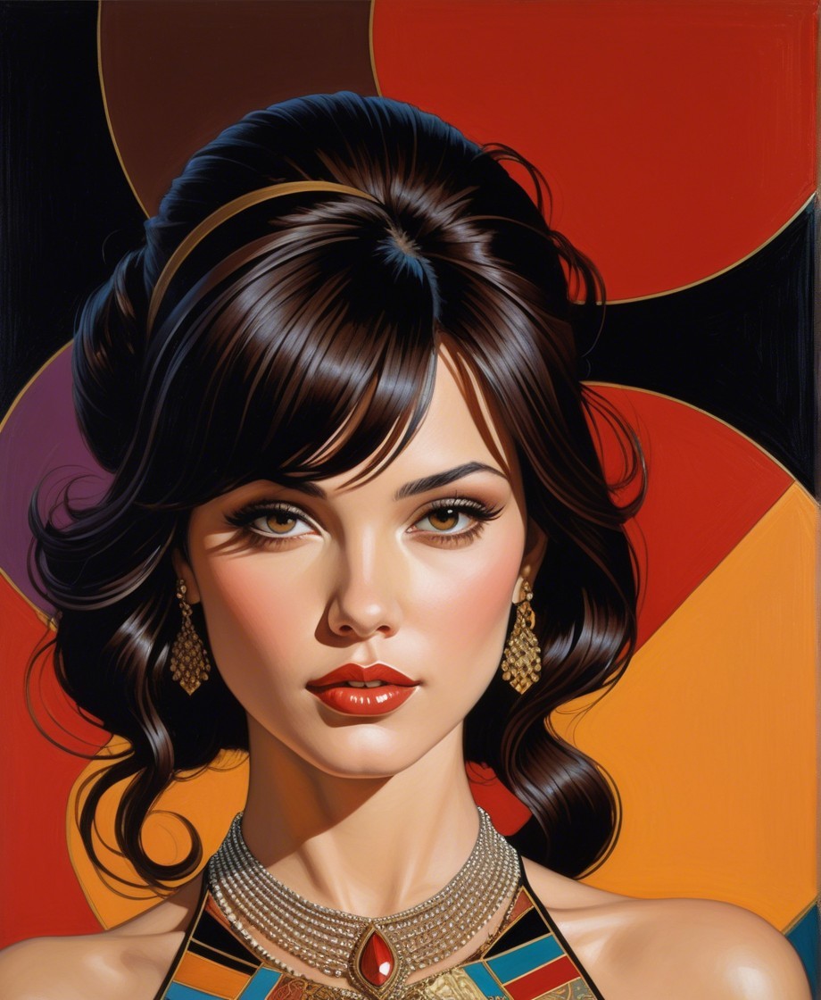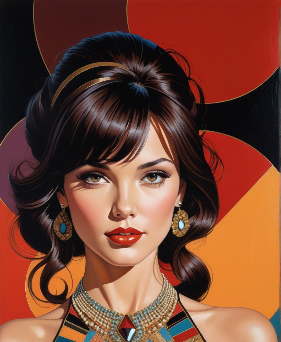 The image features a glamorous woman with dark, wavy hair adorned with intricate jewelry. She has striking makeup, set against a vibrant background of bold, colorful circles.