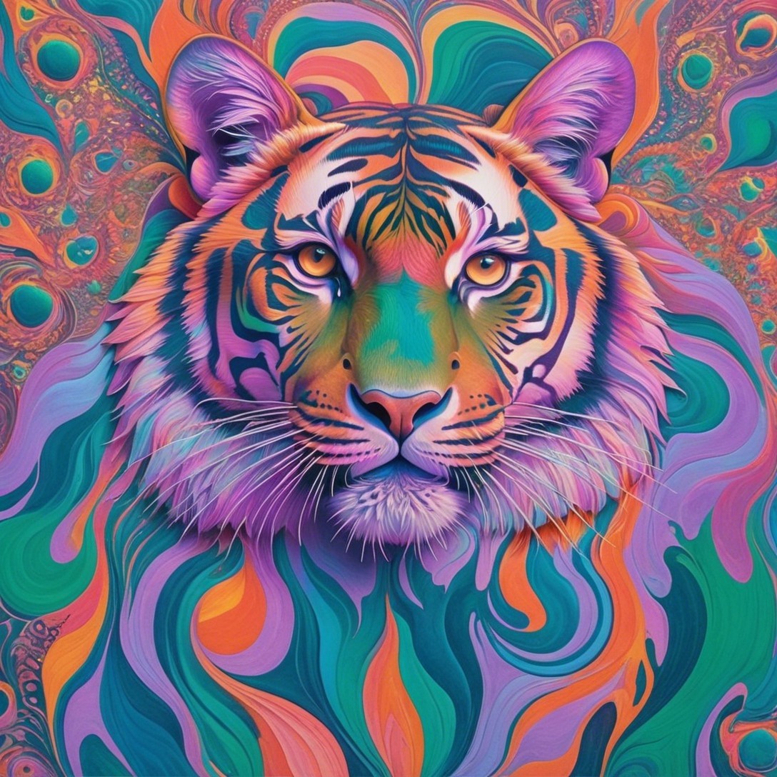 This vibrant artwork features a majestic tiger's face, adorned with bold colors and swirling patterns that create a dynamic, psychedelic background, showcasing the tiger's fierce beauty.