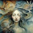 A serene, ethereal portrait of a woman with flowing hair, surrounded by swirling soft hues and delicate birds, evoking a sense of tranquility and dreamlike beauty.
