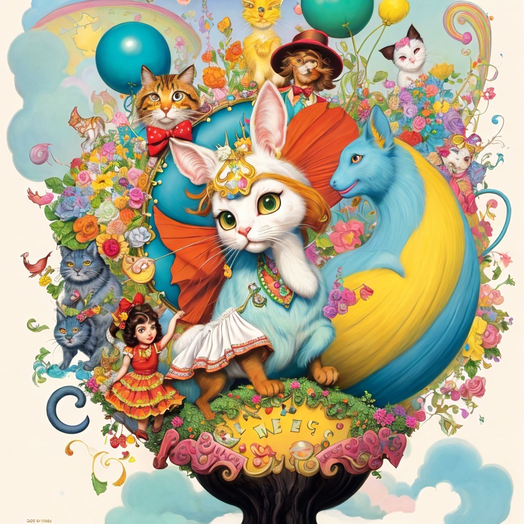 Colorful Anthropomorphic Cats, Animals, and Girl with Balloons in Whimsical Illustration
