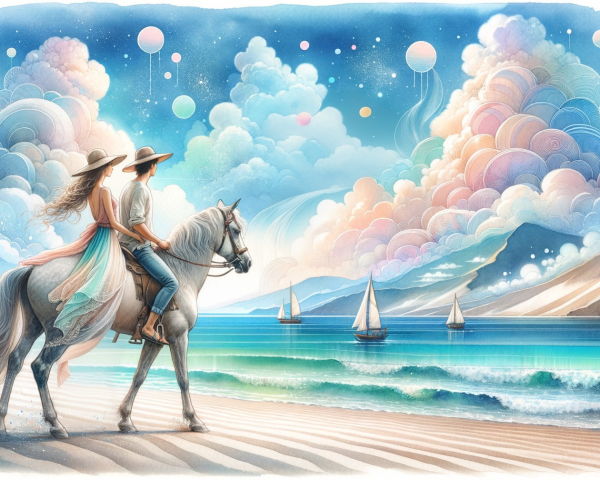 The artwork depicts a stunning Peacock Princess with green hair in a luminous silver and turquoise dress, next to a pond teeming with colorful fish. Peacocks soar in the sky, creating a whimsical and enchanting scene full of intricate details and vibrant colors.