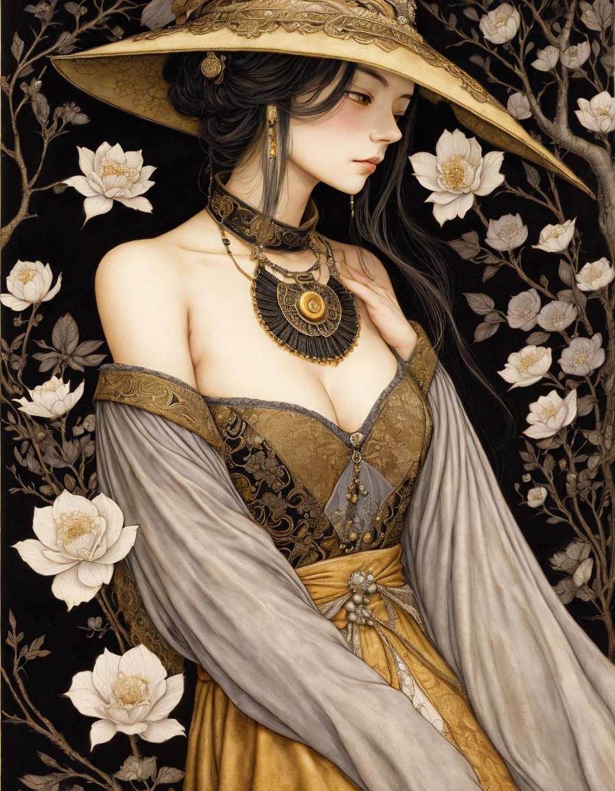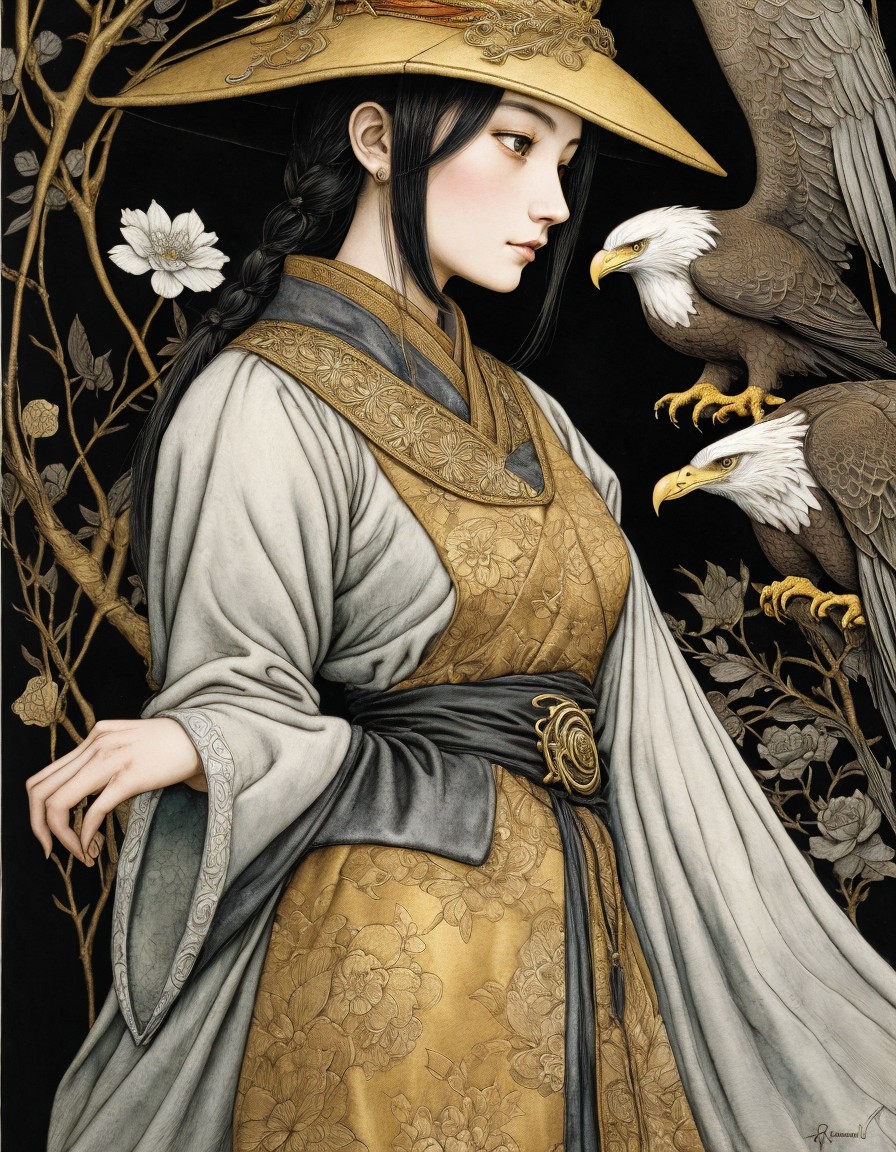 Legend of the Girl and the eagle, Medieval Japanese Artists Sumi-e Style, Velvet Black, Shabby, Dull Gold, Amber Gray, Golden Ratio, Surreal Fantasy, Elegant, High Definition Ultra Fine 3D Line, Zenangle Style, Watercolor Patchwork , Arthur Rackham Style, Paul Kidby, Gediminas Prankevicius, Jacek Jerka, Extremely Detailed, Intricate, Thoughtful, HDR, Fractal, Beautiful, Award Winning, Fantasy Look, Fantasy, Crisp Quality