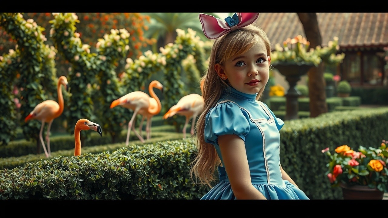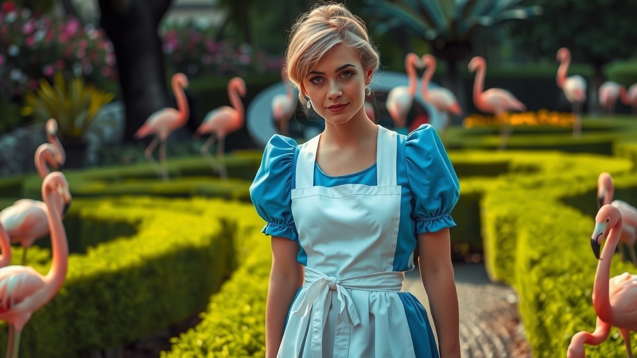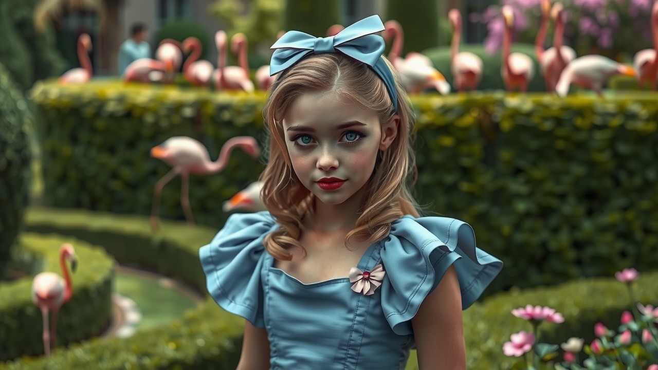 A stunning photorealistic image features an adult in a classic blue dress with a white apron, set against a beautifully manicured garden filled with whimsical pink flamingos.