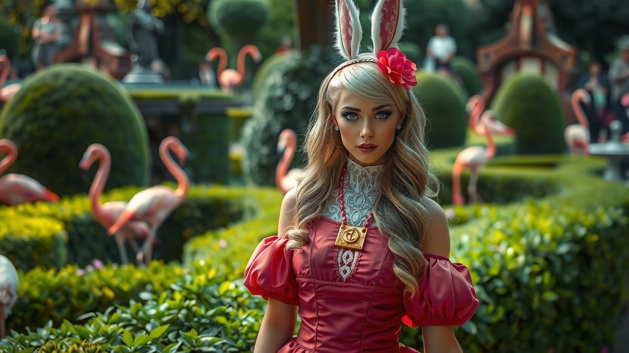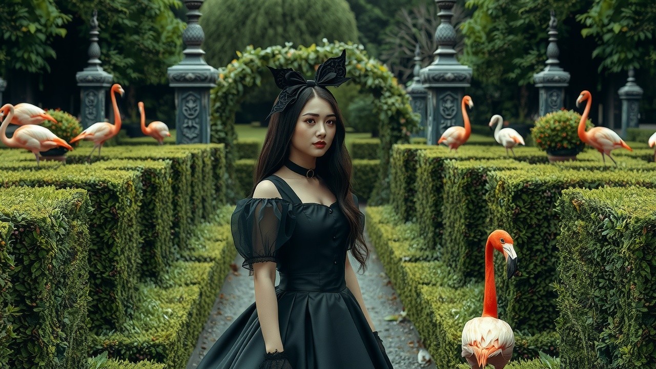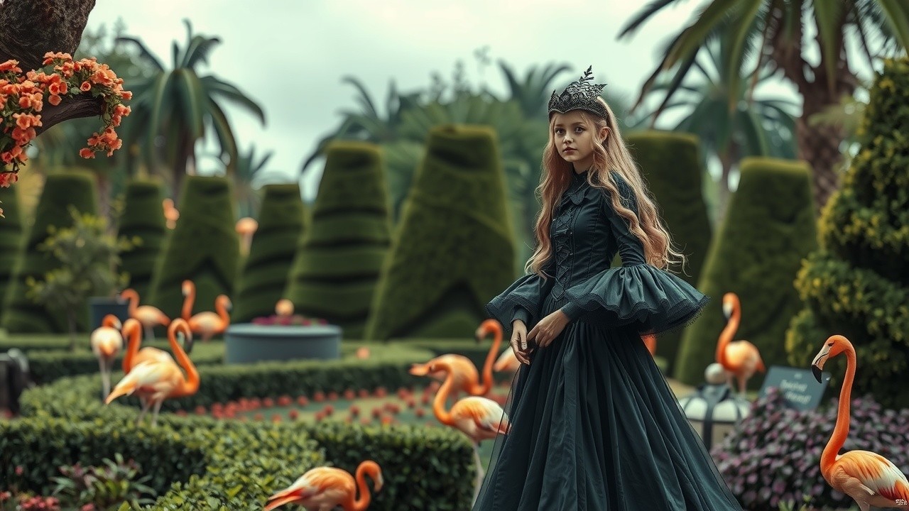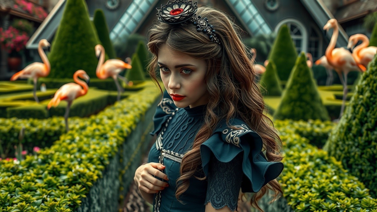 A stunning photorealistic image features an adult in a classic blue dress with a white apron, set against a beautifully manicured garden filled with whimsical pink flamingos.