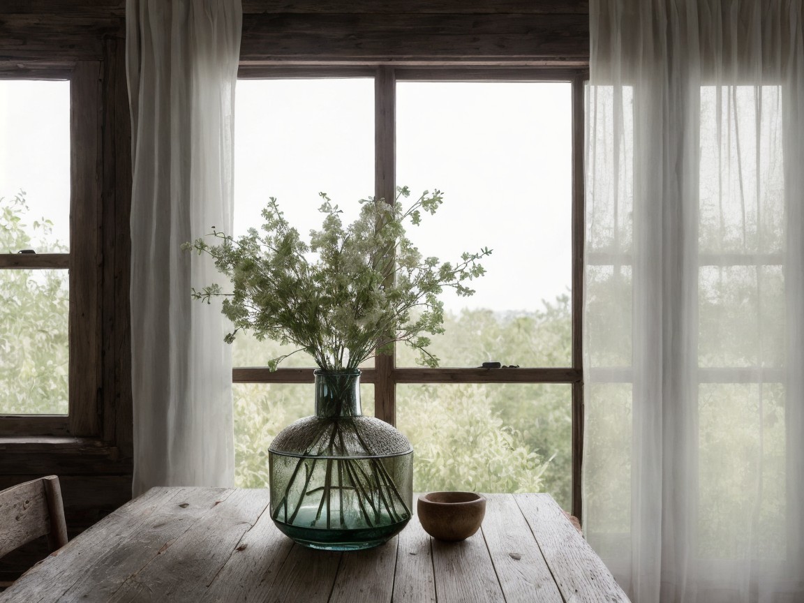 A rustic wooden table holds a large glass vase filled with delicate white flowers. Soft, sheer curtains frame the windows, letting in natural light and offering a glimpse of greenery outside.