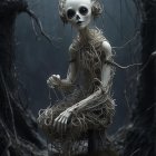 A surreal figure with elongated, skeletal features sits in a mystical forest. Surrounded by moss-covered trees and ethereal lighting, it combines a delicate appearance with an otherworldly essence.