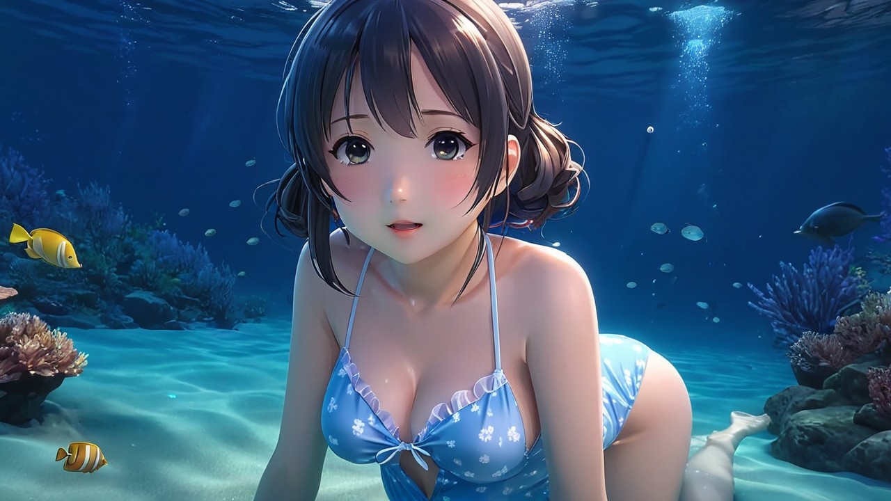 A charming anime girl gracefully swims underwater, wearing a delicate nightgown-style swimsuit. The soft glow of moonlight filters through the water, creating a serene and magical atmosphere.