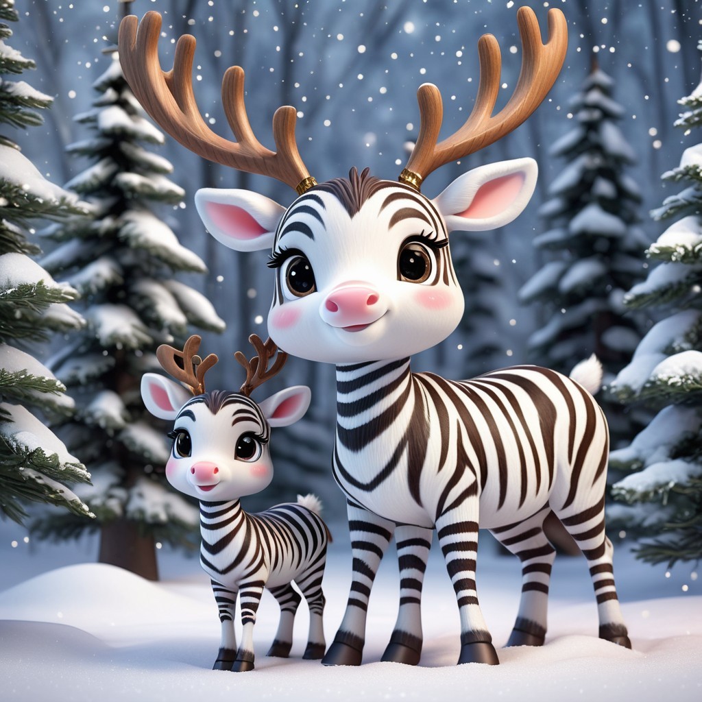 A cute, cartoonish zebra mother and her foal stand in a snowy forest, surrounded by tall pine trees. Soft snowflakes fall gently, adding a whimsical and festive atmosphere.