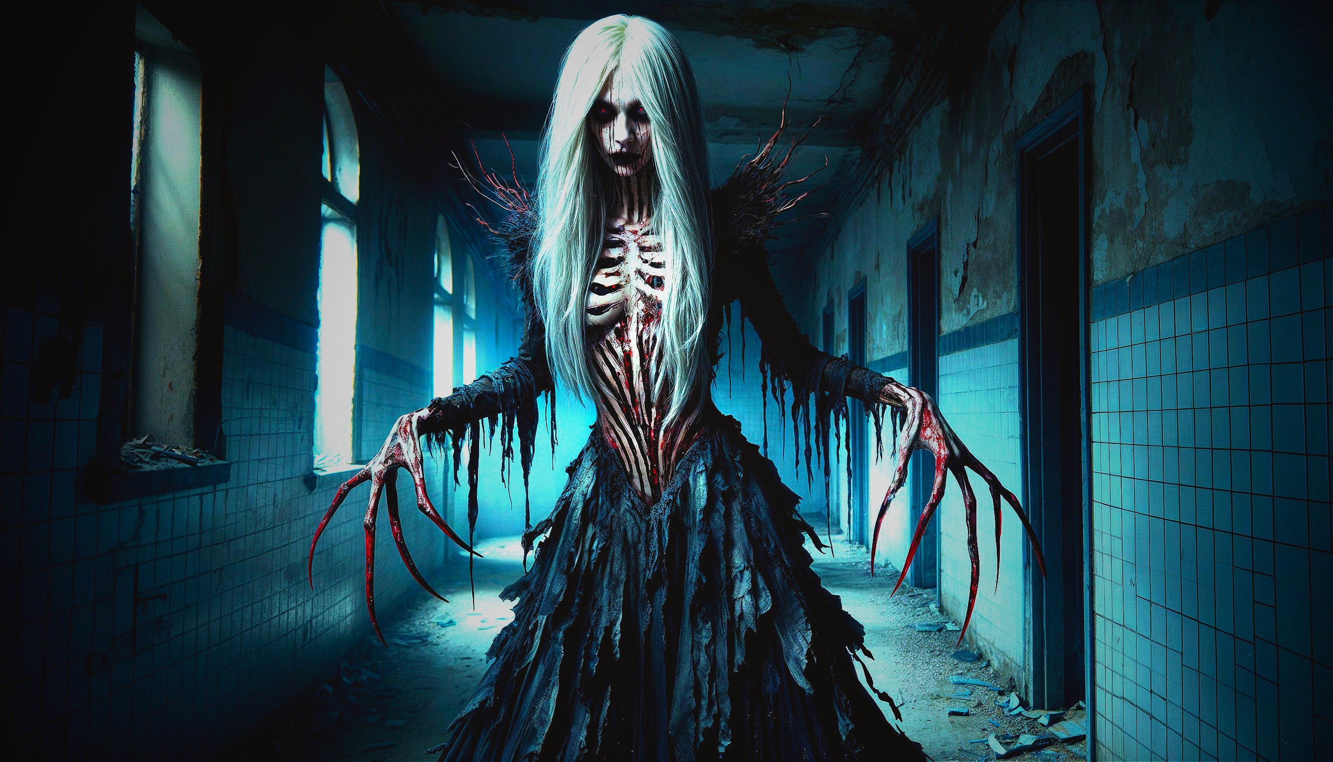 A haunting figure stands in a dimly lit corridor, featuring skeletal features and long, white hair. Clad in a dark, tattered gown, it has elongated, claw-like hands that evoke a chilling presence.