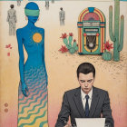 Surreal Desert Scene with Blindfolded Figure and Typewriter