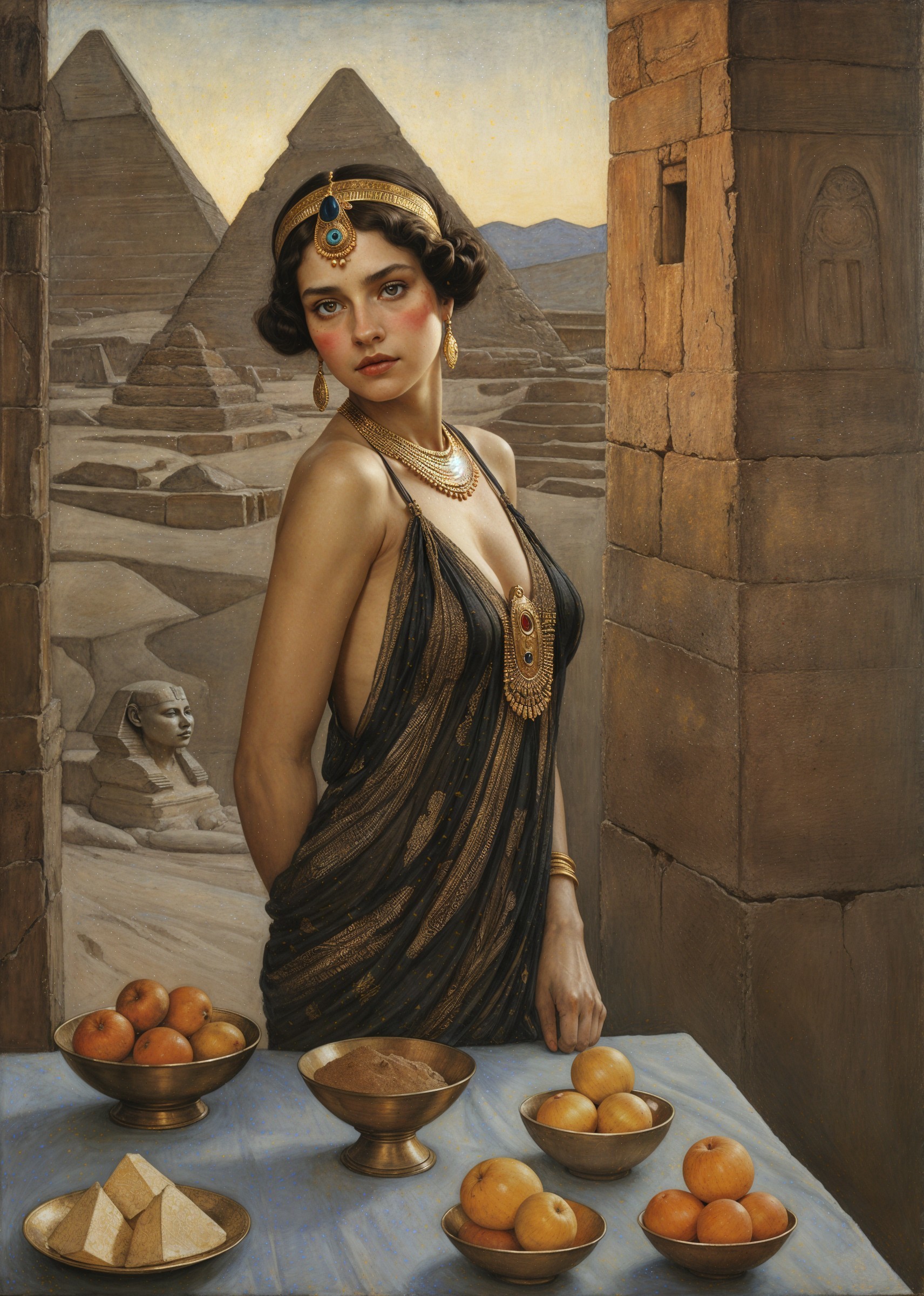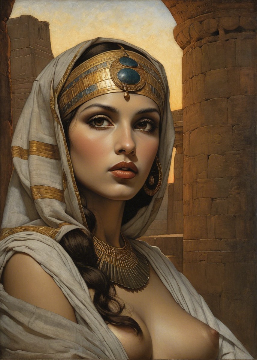 A captivating portrait of a woman with striking features, adorned in luxurious fabrics and intricate jewelry. Her gaze is intense, framed by a delicate headscarf and elegant accessories.