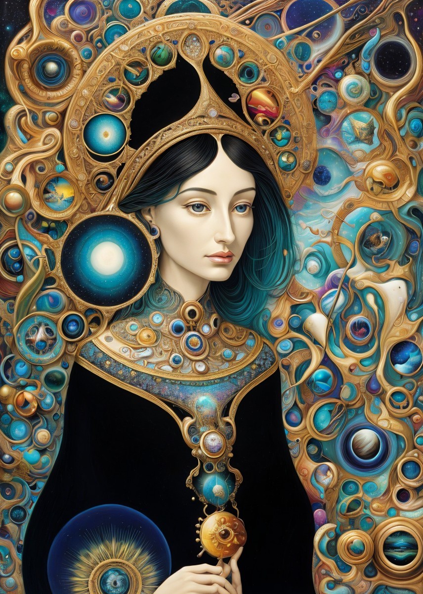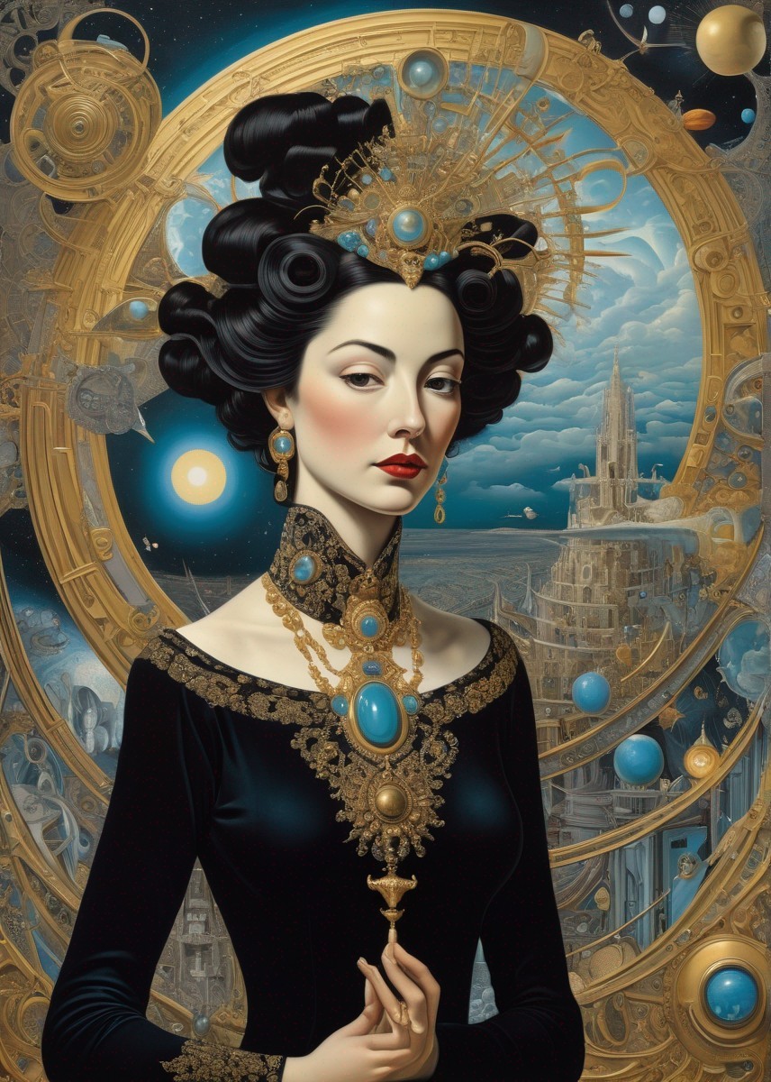 Regal Woman in Black Gown with Cosmic Halo