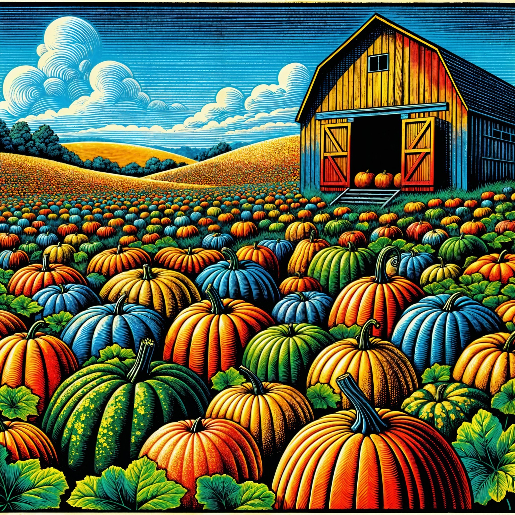 A vibrant autumn scene features a rustic barn surrounded by a colorful patch of pumpkins in various shades. Rolling hills and a dramatic sky complete this picturesque landscape.