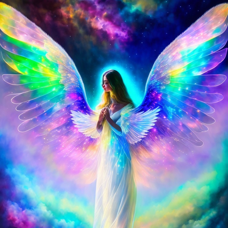 Lucy in the Sky with Diamonds; The outline of an angel diffusion spectrum showcases the ethereal beauty of her spread wings.The image seems to embody a painting, capturing the delicate yet powerful presence of an angelic being. The wings appear as a mesmerizing array of softly diffused pellucid colors, gracefully extending with a sense of divine majesty. Each intricate detail is exquisitely rendered, highlighting the flawless artistic expression, 3D image, Sharp Focus
