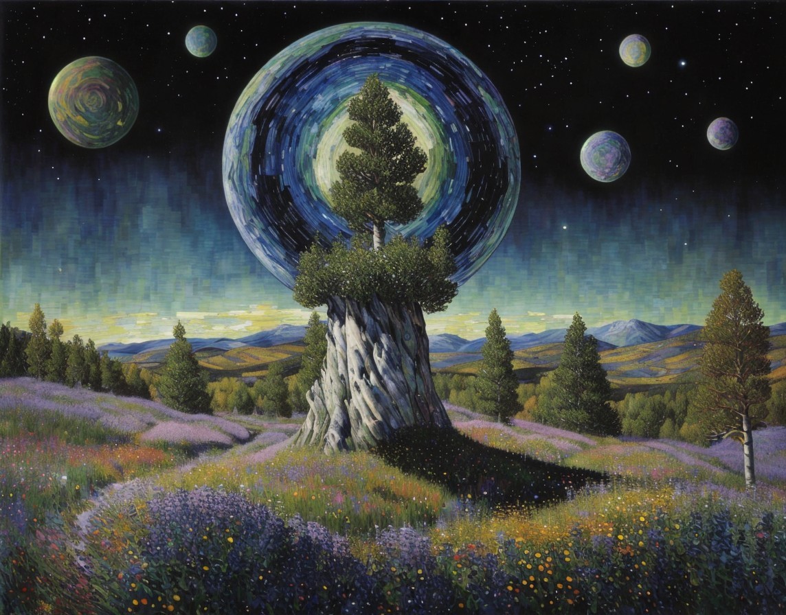 + Prompt:highland flower spectacular, pines and beautiful aspen trees by a gravel path, sunset, cosmic night sky , made of mixed media, acryllc, stained glass and metallic paints. Details by Gustav Klimt and Roger Dean.