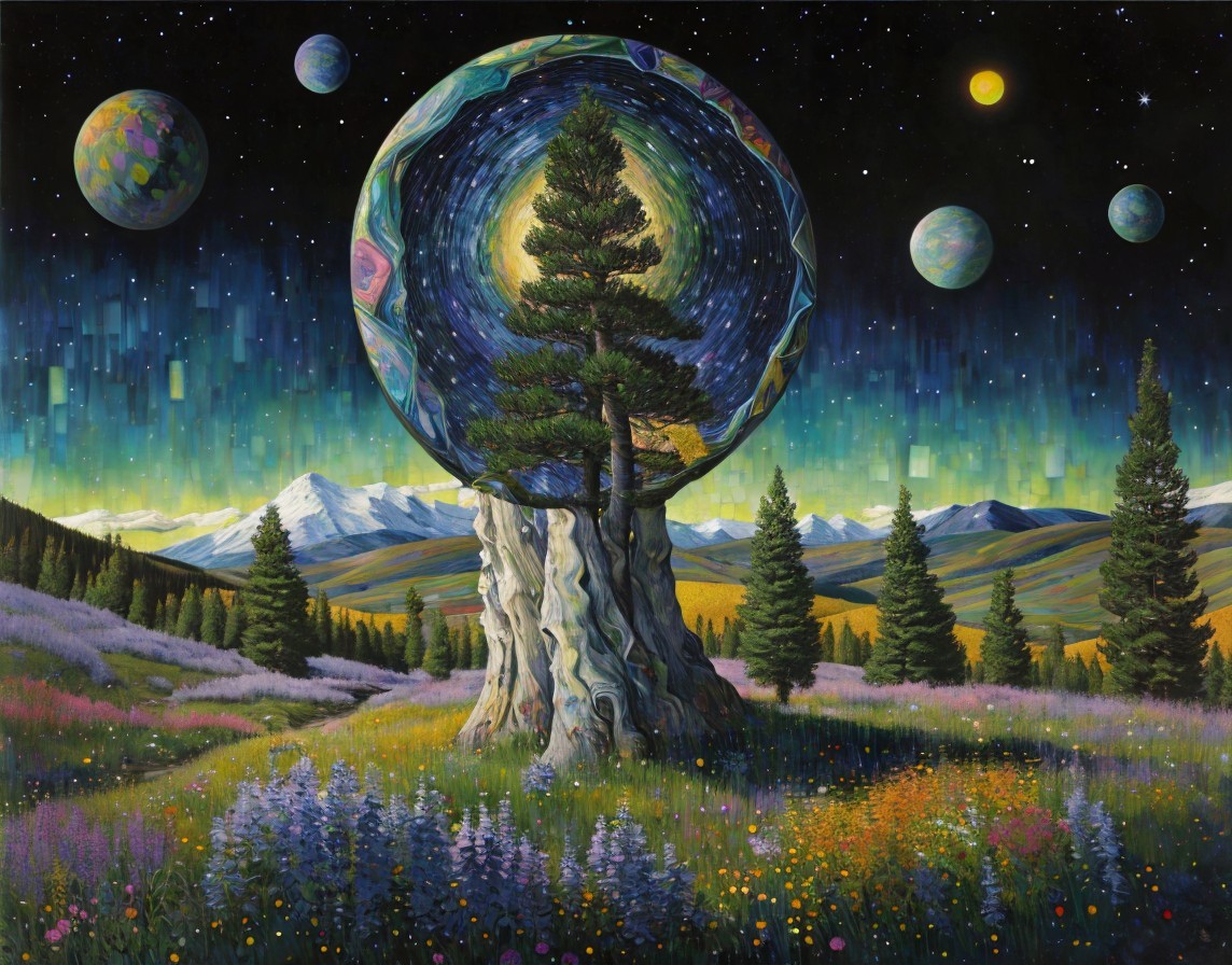 Prompt: highland flower spectacular, pines and beautiful aspen trees by a gravel path, sunset, cosmic night sky , made of mixed media, acryllc, stained glass and metallic paints. Details by Gustav Klimt and Roger Dean.