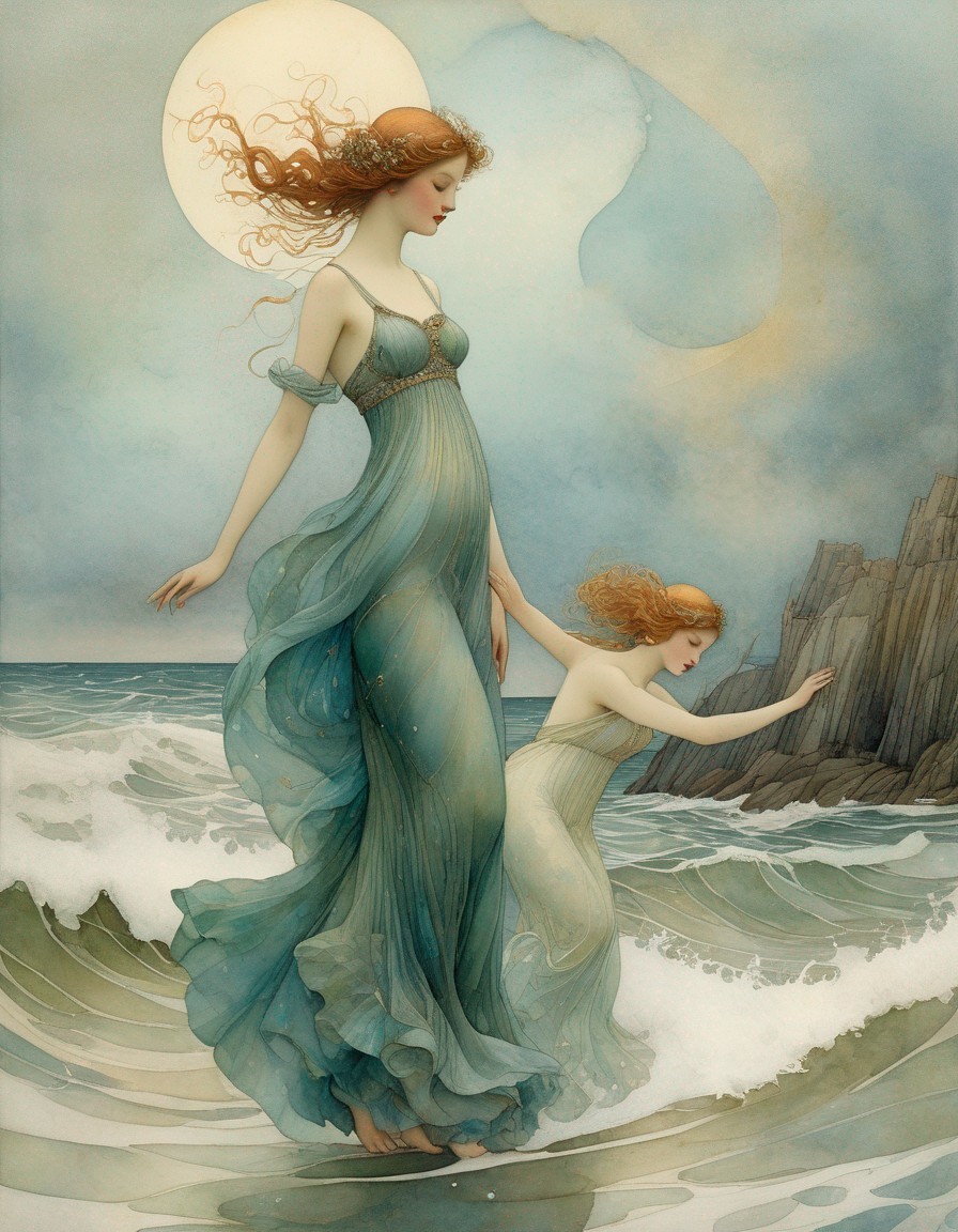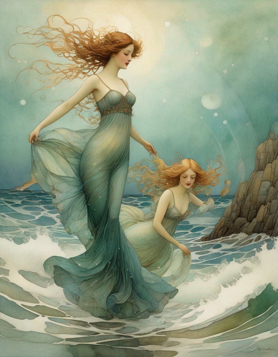 + Prompt:Beautiful sea nymphs frolicking in the waves. Iridescent watercolor and ink By Jamie Heiden, Daniel Merriam, Paul Klee, Karol Bak, Dee Nickerson, extremely detailed, high definition, crisp quality, ultra detailed background art nouveau
