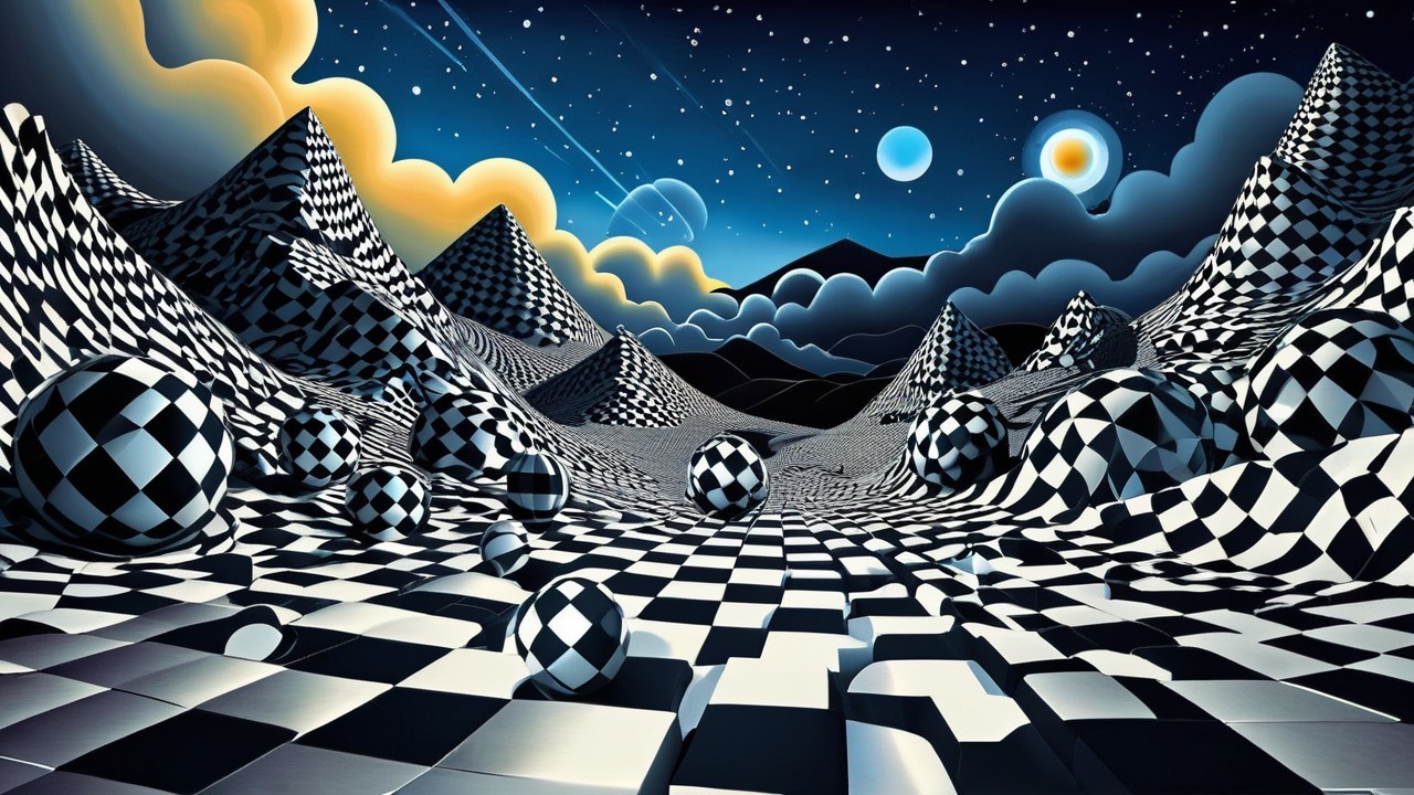 A vibrant, surreal landscape features cascading cube hills and whimsical magenta trees under a swirling night sky. A charming red cabin sits atop a lush mound, illuminated by soft twilight light.