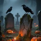 A misty cemetery at night, illuminated by a full moon. Two ravens perch on moss-covered tombstones, surrounded by glowing candles, carved pumpkins, and vibrant autumn leaves.
