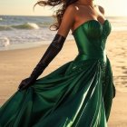 A woman stands on the beach at sunset, wearing a flowing green gown adorned with sparkling embellishments. Her hair billows in the wind, creating a captivating and serene atmosphere.