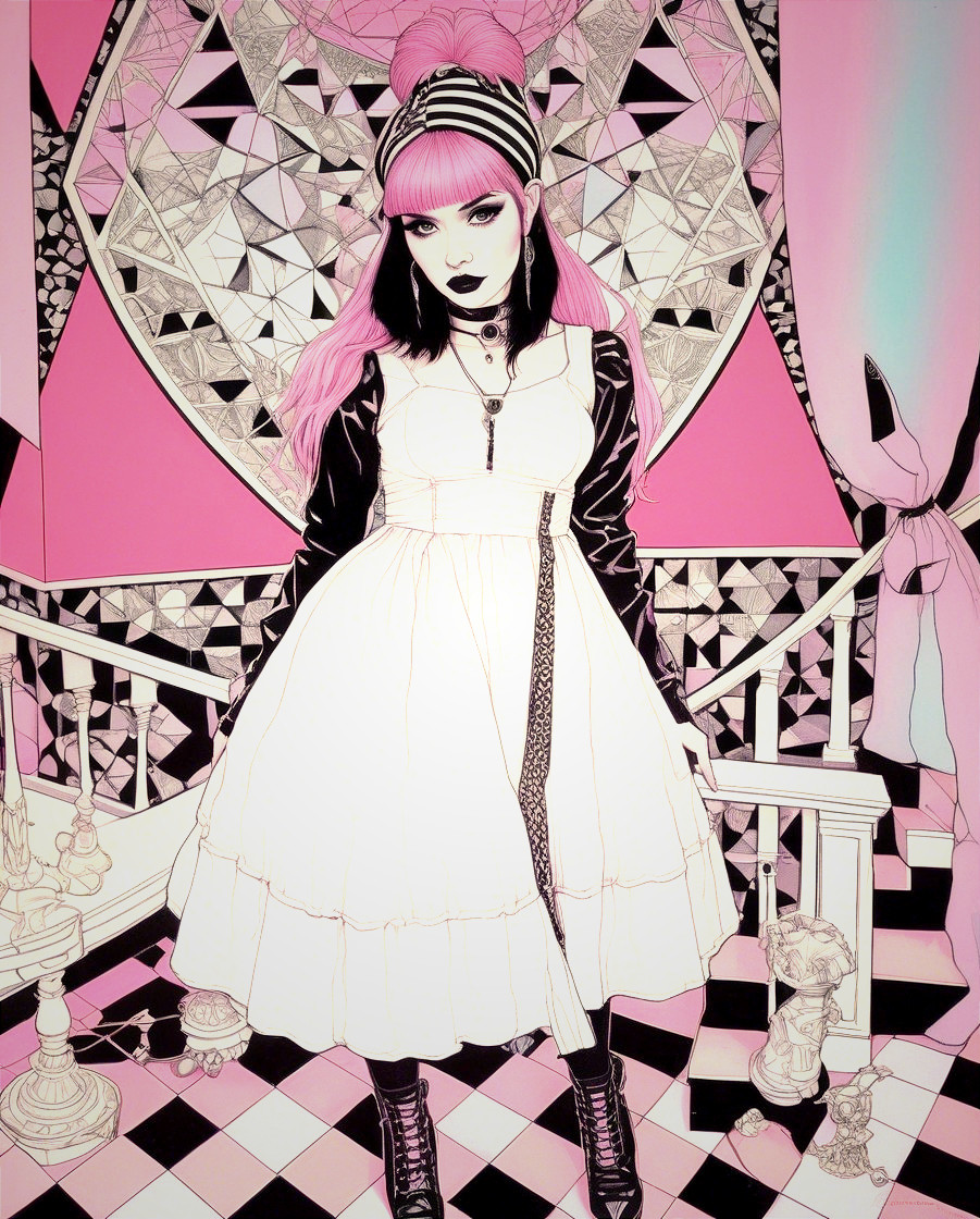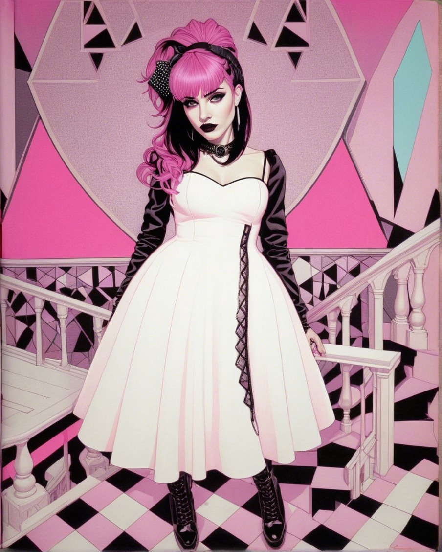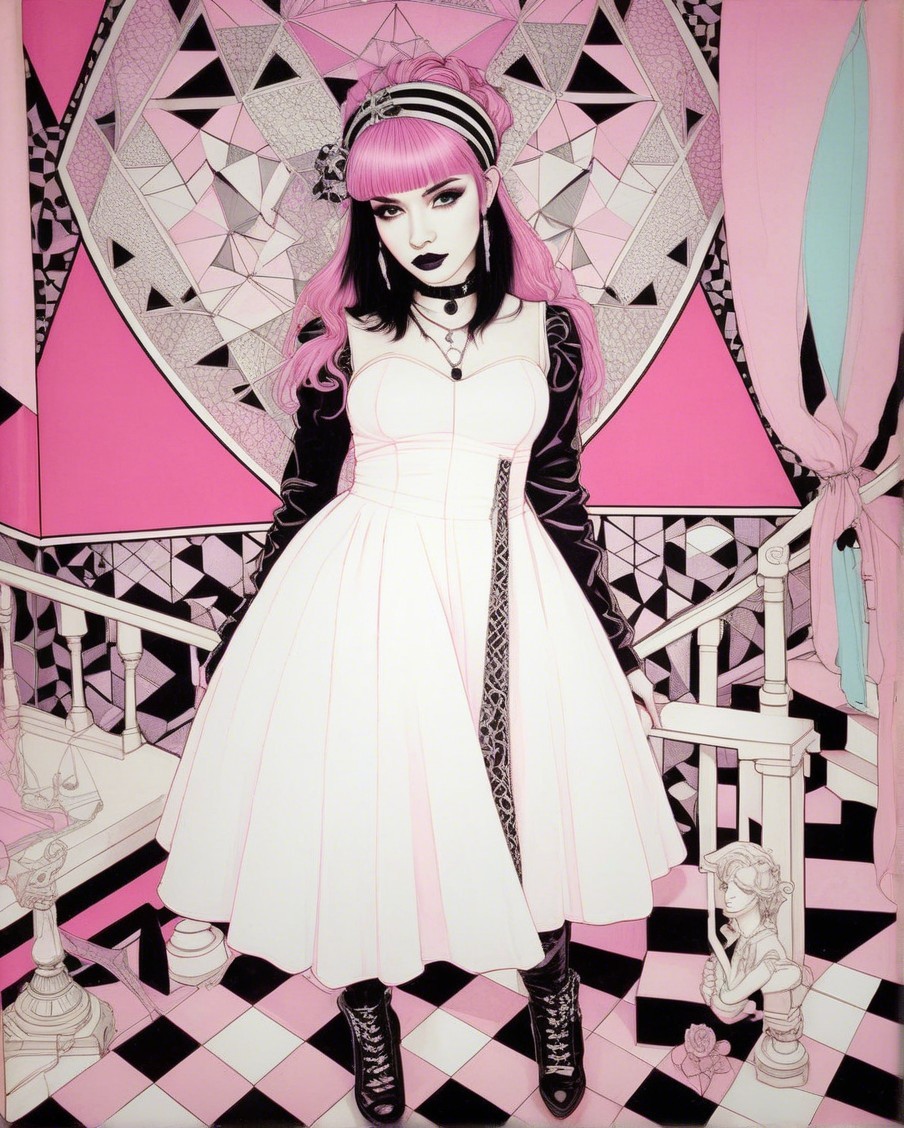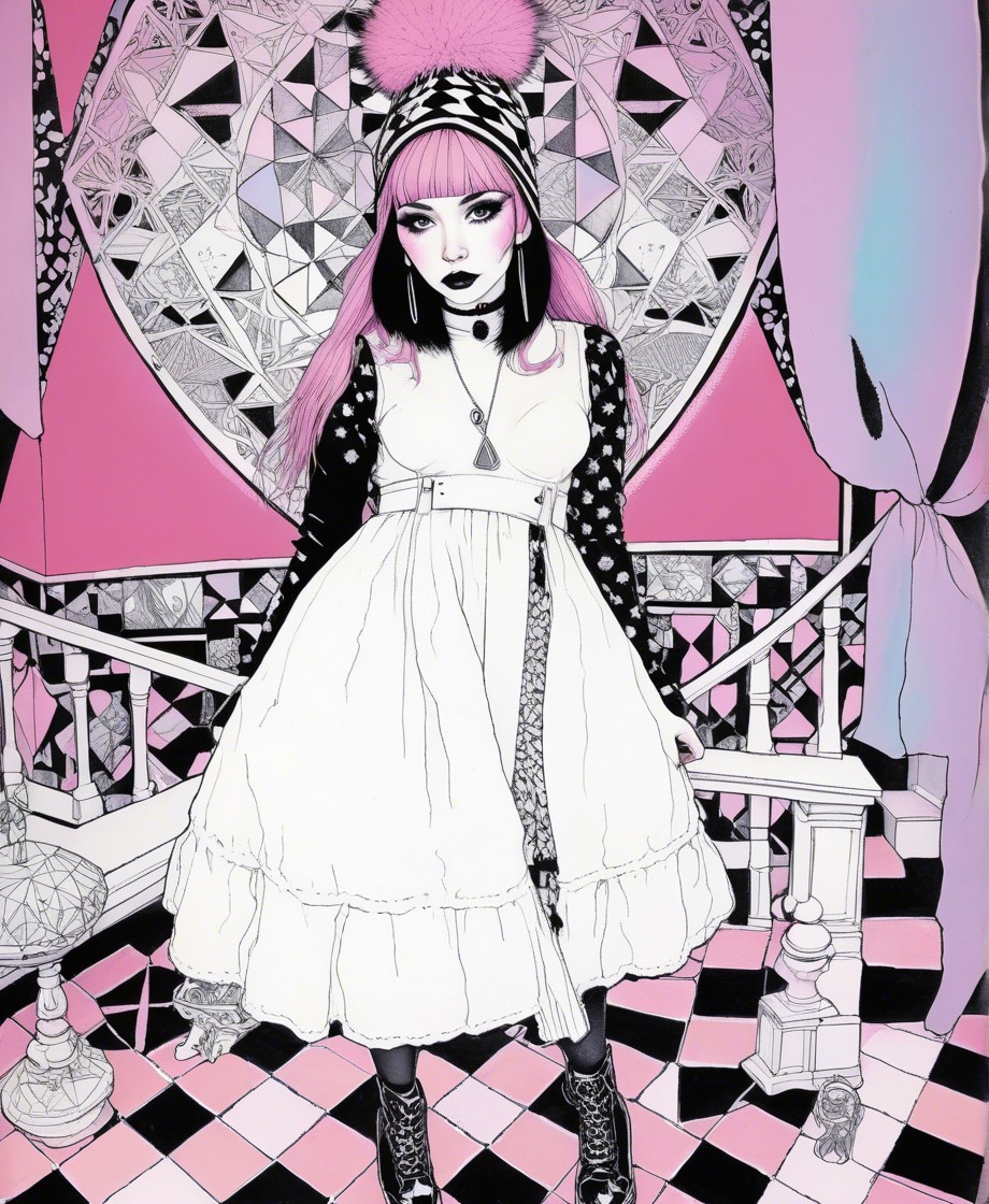 Prompt: Scruffy portraiture by Darren Waterstron and Man Ray, asymmetrical geometrical styles, full body portrait, dark gothical fantasy, 1980's comic book art, raytraced shadows, 3d effects, line-art, intricate elements of foampunk, tetradic color scheme dark-pink light-pink rosewood-pink beige, sketch book art, pen and ink, crackles,whimsical indiecore, detailed linework, whimsical and psychedelic ambiance, strict indiecore with hatching details, soft color glitch, queer, weathered and aged feel, ethereal atmosphere, fantasy elements, alternative cinema reminiscence, warped with precise execution. Stacked lines with Colored ink by Stan Lee and Ho Baron, backdrop in triadic color scheme pink-red light-pink black, complex estranged colors, psychedelic Woodblock Print: gothic rock woman, comical, slightly exaggerated features, collage-art, mixed media, ambient occlusion by Ho Baron, lighting by Ed Paschke, wavery texture, pellucid details, juminocore elements, grunge aesthetic, fusion art Debeh, dof, bokeh effects, vfx-inspired layered hues, only curves, stylized woodblock print by Ed Binkley, plasticity 1.2, Debeh, dof, bokeh effects, vfx-inspired, layered hues, oil blend technique, complex airbrush overspray, layered, dyed, calm, intricate dark fantasy elements, tonalism influence, soft line-art details, plasticity 1.3, bloom-effect, raytraced shadows for depth, micro-pen lines for precision, splash ink technique reminiscent of Marc Allante, warm pinkish tones, colorful yam, line-art details, pink accents, psychedelic psychpomp theme, subsurface scattering for a unique touch,