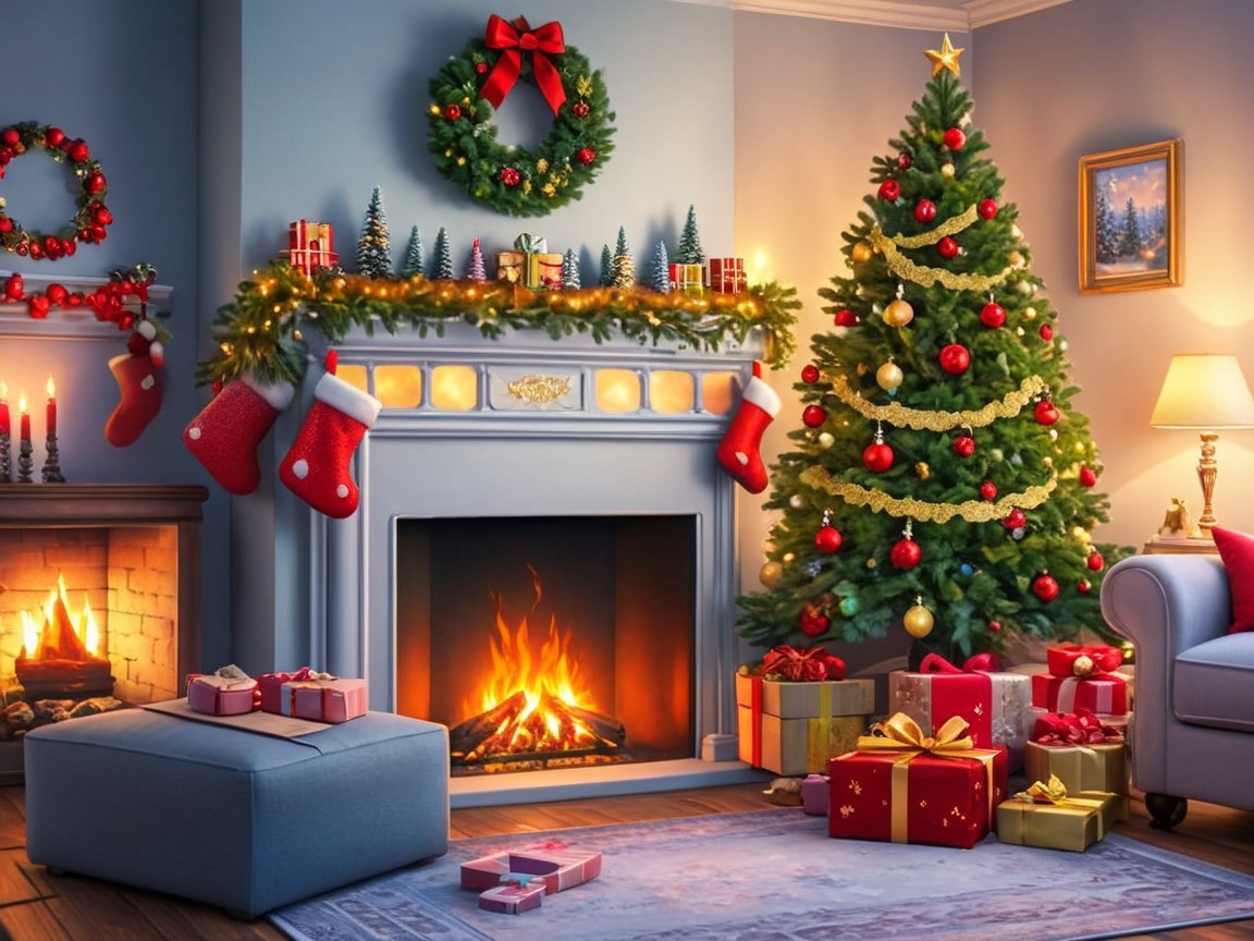 A cozy living room with Christmas decorations. A Christmas wreath with a red bow hangs on a light blue wall, above a fireplace with a mantelpiece adorned with a long garland, miniature Christmas trees, small gift boxes, and two red stockings. Another fireplace with a lit fire stands in the corner. In