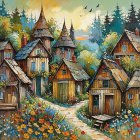 A whimsical scene featuring colorful, fairy-tale houses with pointed roofs, surrounded by vibrant autumn foliage and flowers. A winding path leads through this enchanting landscape under a glowing sun.