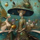 The image features two elegantly dressed women surrounded by whimsical elements. They have intricate patterns on their outfits, adorned with fantastical accessories and ethereal, serene expressions.