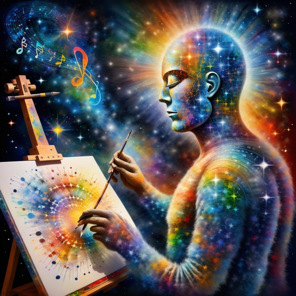 A vibrant illustration of a cosmic being painting a canvas with a spectrum of colors, surrounded by stars and celestial energy.
