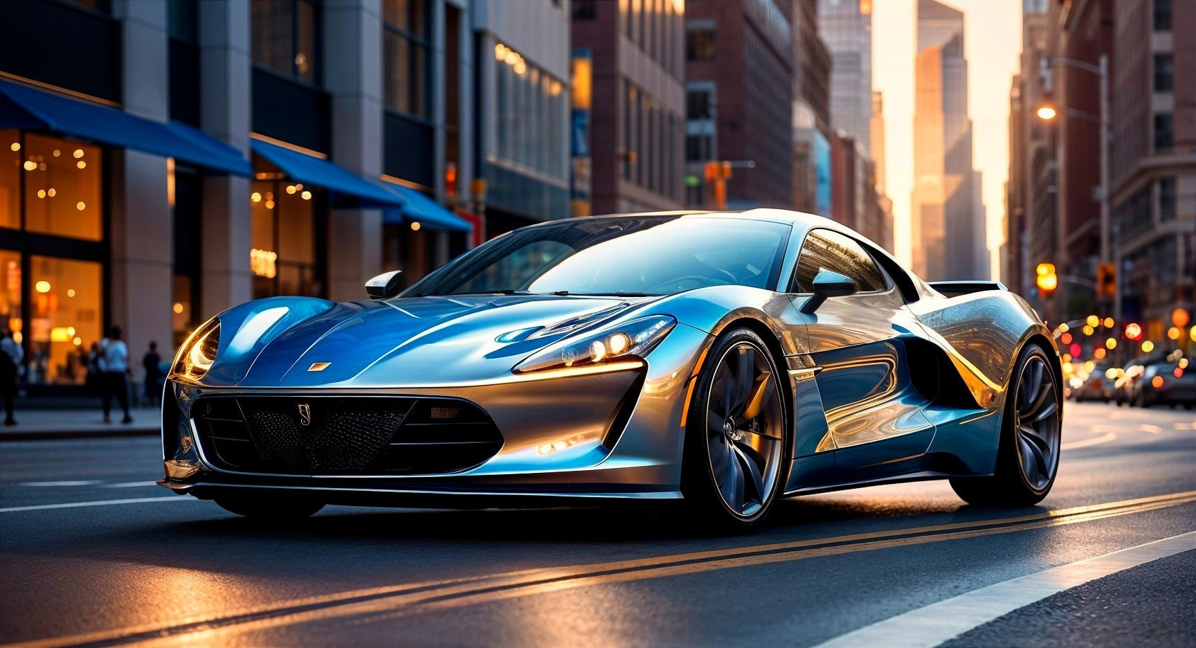 Prompt: A sleek, aerodynamic sports car with iridescent blue and silver metallic paint, illuminated by warm golden hour light, set against a blurred, vibrant cityscape in soft bokeh, with sharp focus on the car's dynamic lines and curves. The car's reflective surfaces glimmer with subtle, nuanced highlights, while the city's towering skyscrapers and bustling streets fade into a warm, sun-kissed haze. Inspired by the hyper-realistic, high-octane style of Syd Mead, Ash Thorp, and Simon Stalenhag, with meticulous attention to detail and a cinematic, low-angle perspective, evoking a sense of drama and power.