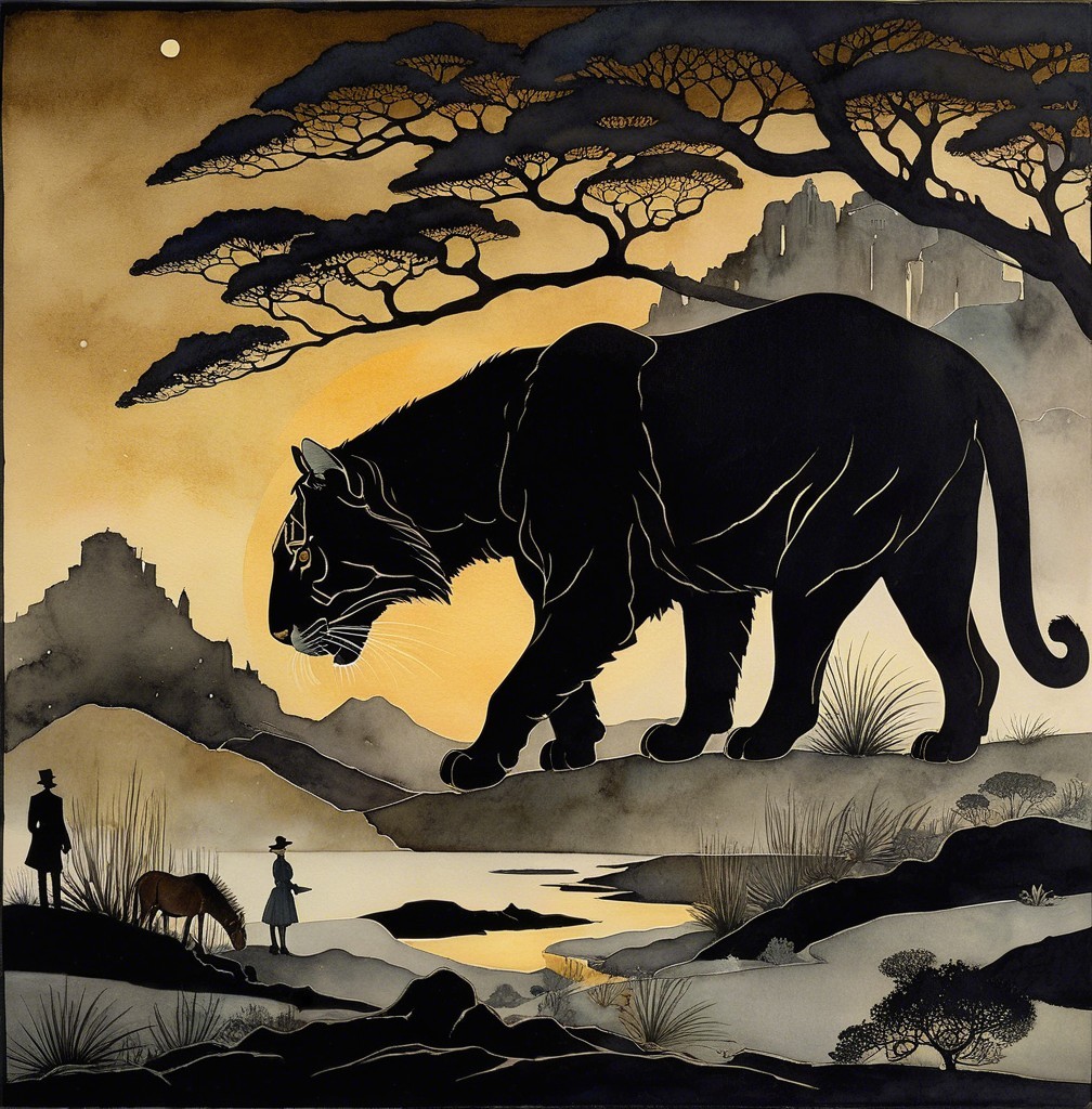 In a dramatic silhouette, a colossal tiger looms over a serene landscape. A couple sits by a river, gazing at the majestic creature against a backdrop of mountains and a distant castle.