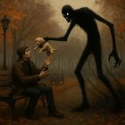 In a peaceful autumn park, a man sits on a bench holding a beagle. A tall, shadowy figure looms nearby, reaching out to snatch the man's dog, while a small black dog watches the scene.