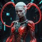 A striking figure stands against a dark, textured background, adorned with vibrant orange and black body paint. The artistically cracked design creates a blend of elegance and edginess.