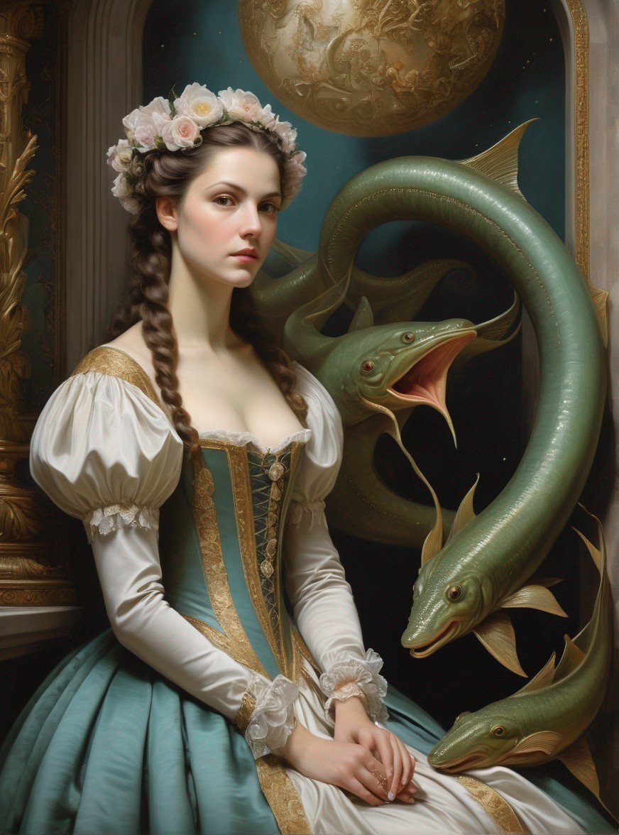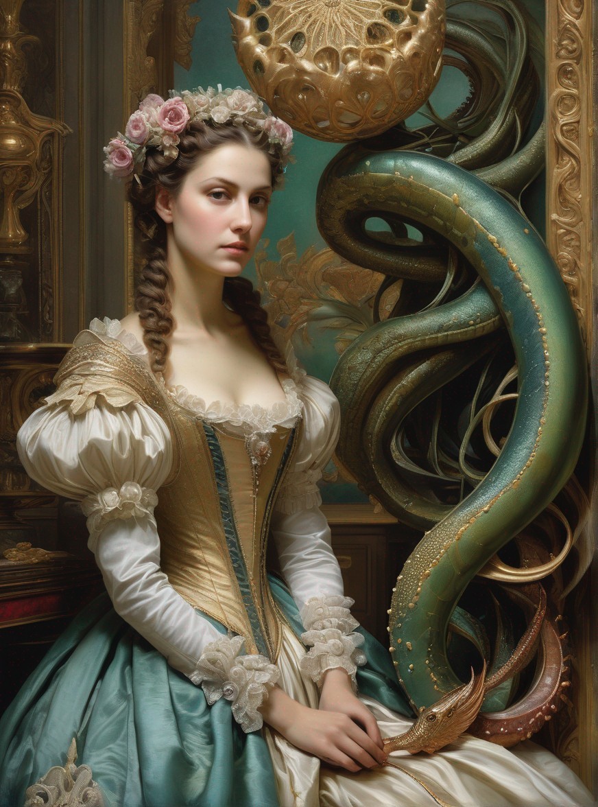 + Prompt:Lovecraftian fairytale. This artwork amalgamates the artistic styles of Lavinia Fontana and Sarah Goodridge, showcasing a harmonious fusion of their respective techniques. The painting exemplifies a seamless integration of Fontana's mastery of portraiture and Goodridge's delicate brushwork, resulting in a visually captivating composition that embodies the essence of both artists' unique contributions.